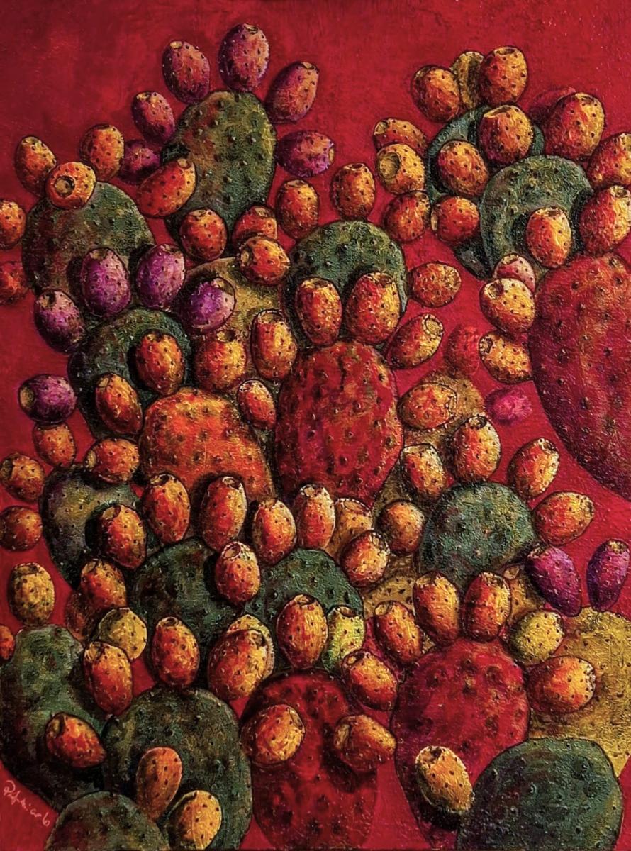 L'intera superficie è ricoperta da una fitta e dinamicacomposizione di pale e frutti di Fico d'India.