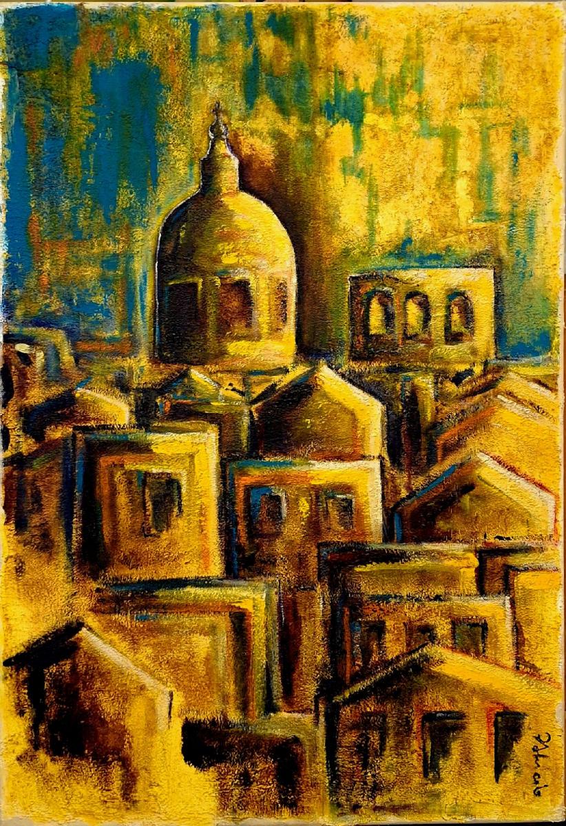 Acrilico su tela, TelaQuesta veduta urbana, realizzata con acrilico e pasta materica, si presenta come un’immersione vibrante nel cuore pulsante di una città che sembra riemergere dalla memoria o da un sogno mediterraneo.Osservando la tela, la prima cosa che colpisce è la potenza della texture. L’uso mirato della pasta materica non si limita a dare tridimensionalità ma conferisce all’opera una qualità quasi "archeologica": le superfici appaiono scabre, vissute, come se i muri delle case avessero assorbito secoli di sole e di storie. Questa ricerca sulla materia, che è centrale nel mio percorso artistico visibile su blascomariapatricolo.it, qui si traduce in un dialogo serrato tra la solidità dell’architettura e la fluidità della luce.La composizione è dominata da una palette calda, dove l’oro e l’ocra regnano sovrani, evocando una luce meridiana intensa che quasi abbaglia. Tuttavia, è il contrasto con i blu profondi e le ombre decise a dare struttura al caos apparente delle volumetrie. La cupola, punto focale dell'opera, si erge con una dignità silenziosa sopra l’incastro serrato delle abitazioni, fungendo da bussola visiva in questo labirinto di tetti e facciate.C'è una tensione espressionista nel modo in cui i contorni si fondono e si sfrangiano. Non cerco la precisione del dettaglio architettonico ma l’essenza dello spazio urbano: quel senso di appartenenza e, al contempo, di smarrimento che si prova camminando tra vicoli antichi. Le finestre, accennate come varchi oscuri nella materia densa, suggeriscono una vita interiore degli edifici che rimane volutamente inaccessibile allo spettatore.In quest'opera, il confine tra figurazione e astrazione materica si fa sottile. La città diventa un pretesto per esplorare la densità del colore e la capacità della tela di trattenere la luce. È un invito a toccare con gli occhi la ruvidità del tempo, trasformando una visione urbana in un’esperienza sensoriale tattile e profonda.